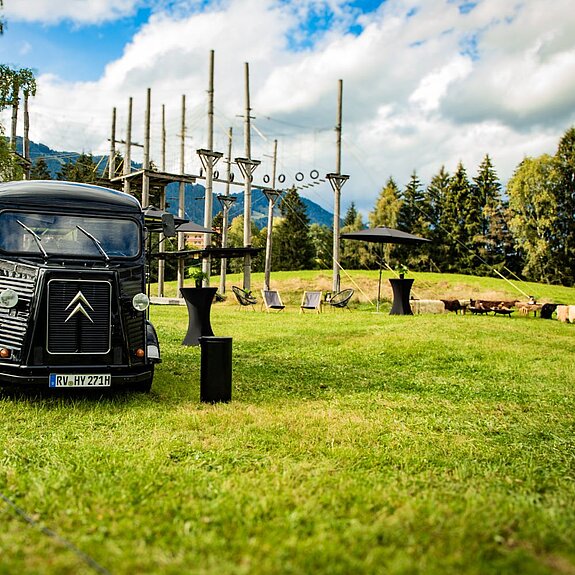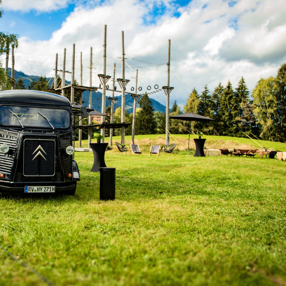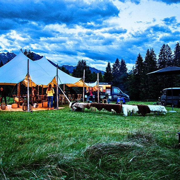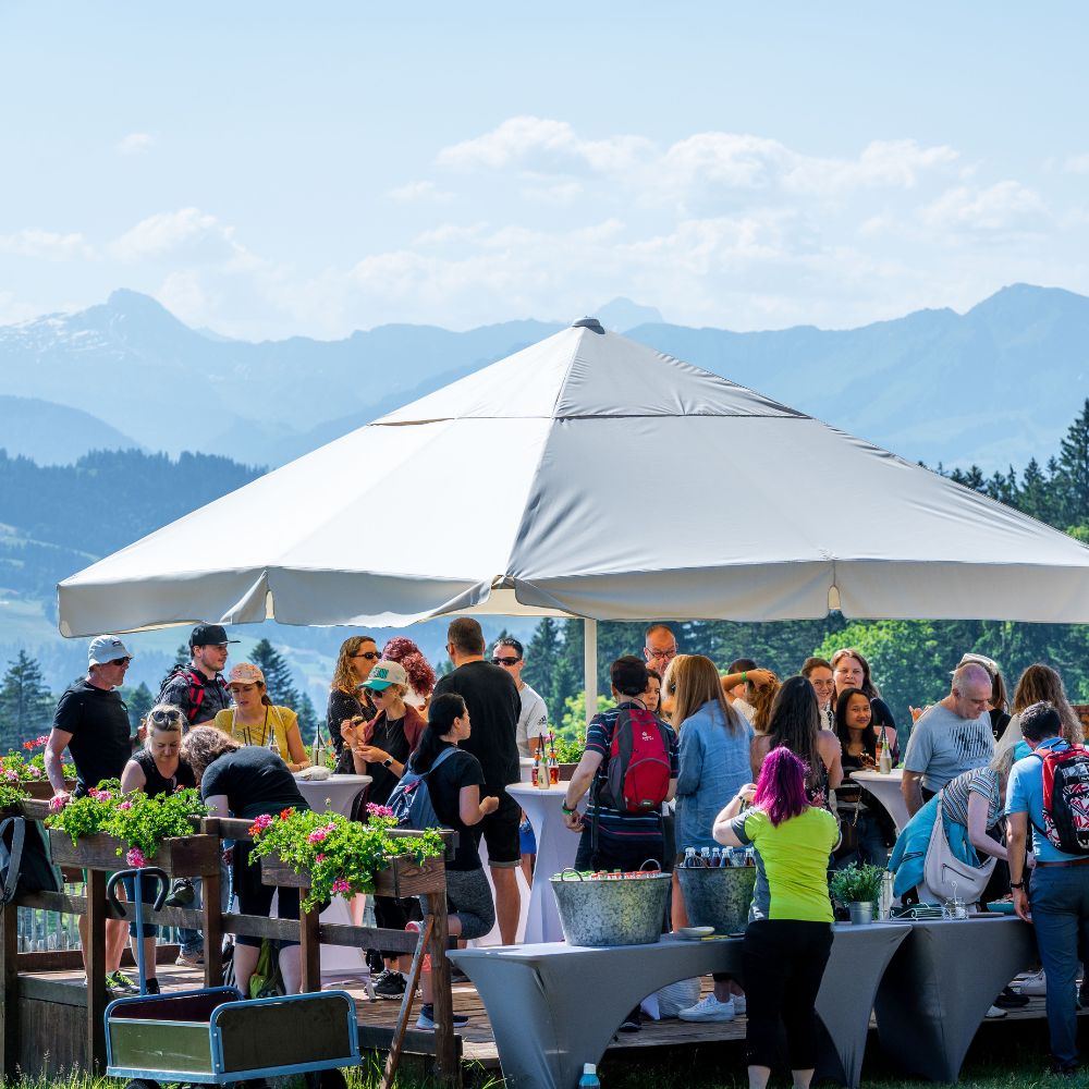 Blauer Himmel. Grüne Wiesen. Gipfel im Rücken. Die PopUp Location ist Ihre Bühne für Events, die niemand vergisst. Hier feiern Sie mit 50 bis 150 Personen, draußen, mittendrin in der Natur, mit allem Platz der Welt. Teamevents, Sommerfeste, Jubiläen: Was drinnen eng wird, entfaltet sich hier. Die Berge geben den Rahmen. Sie füllen ihn mit Leben.