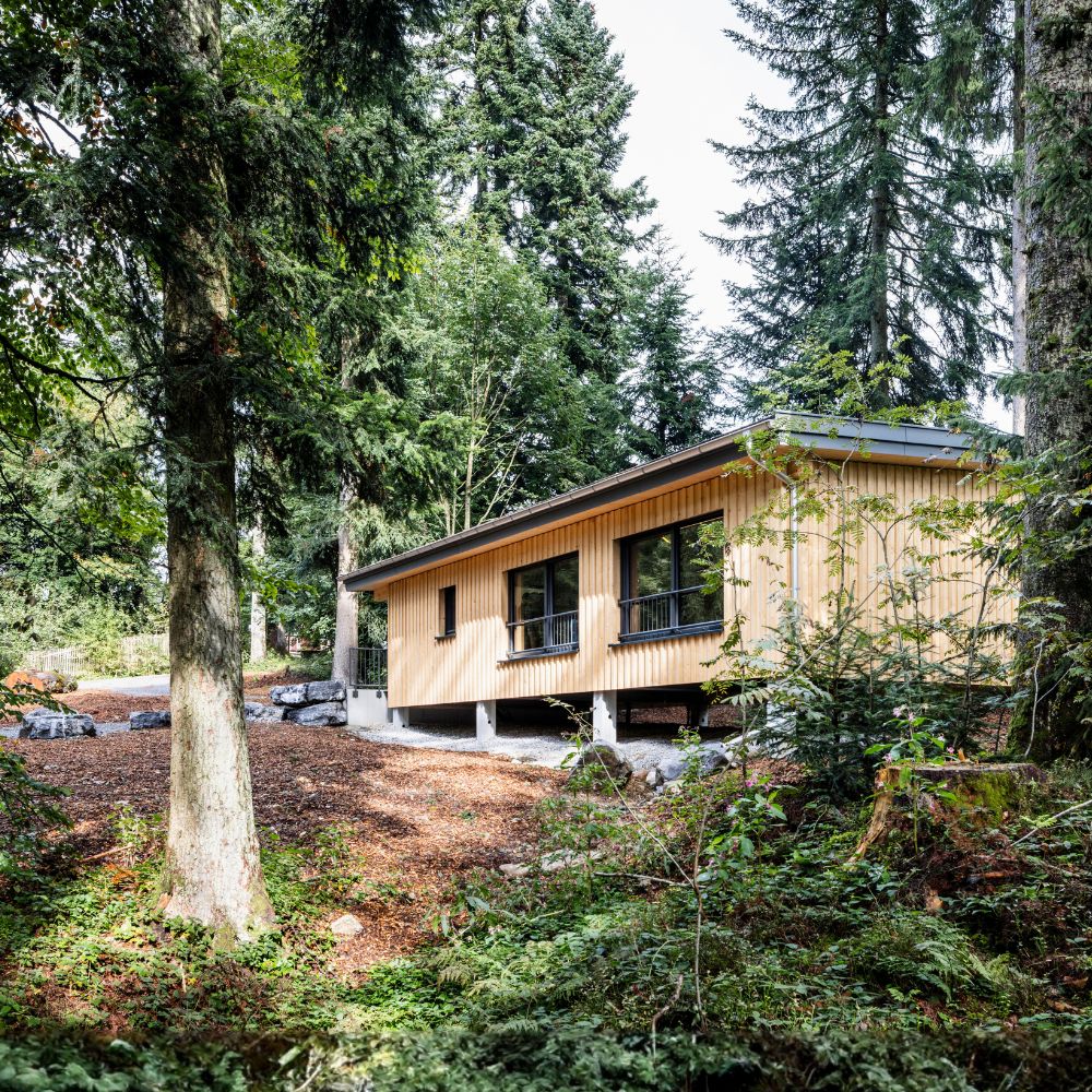 Große Schiebefenster, Duft nach frisch geschlagenem Holz, freier Blick auf Bäume. Die ruhige Natürlichkeit senkt das Stresslevel, fördert Konzentration und öffnet Raum für Inspiration.